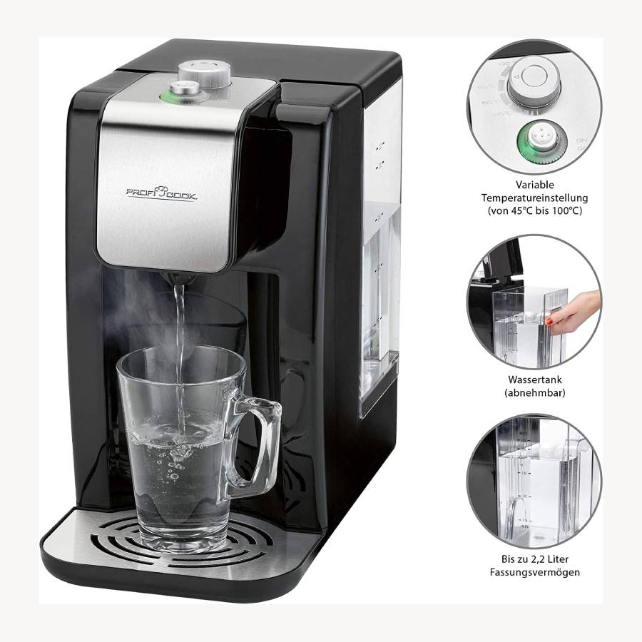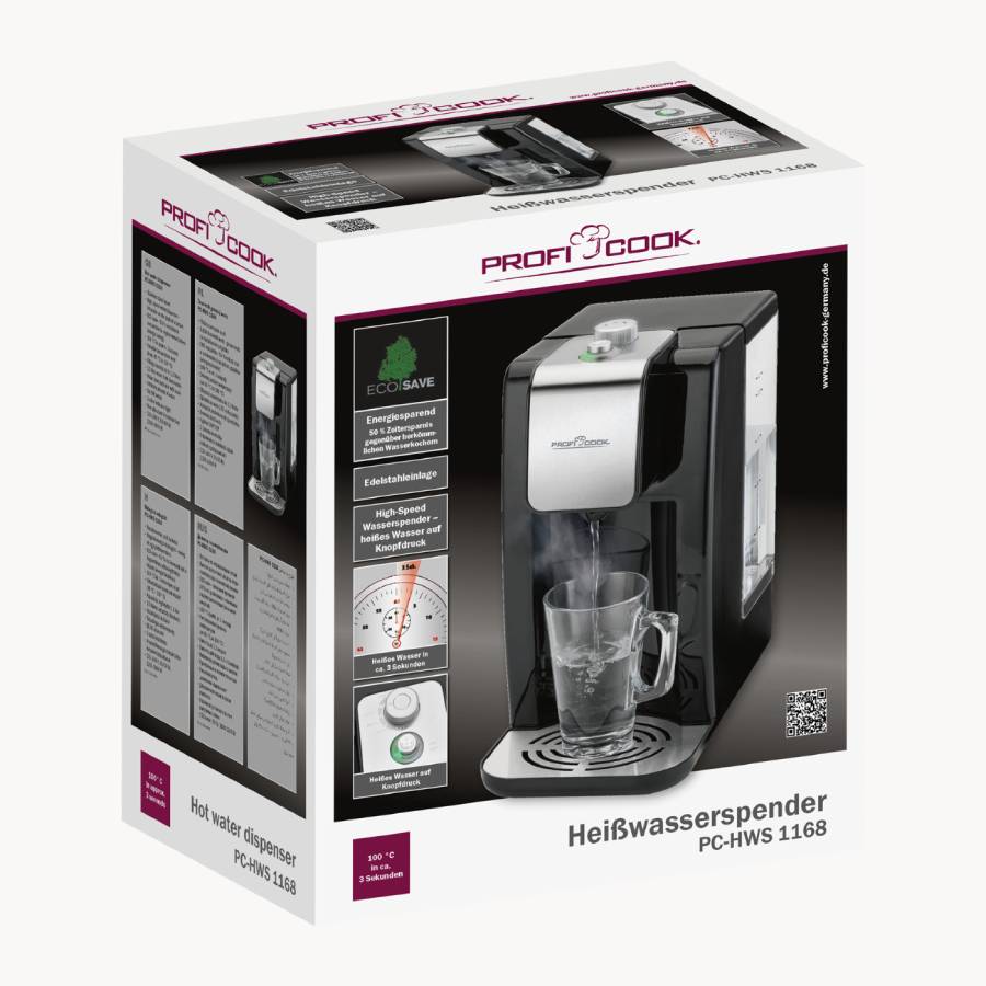 آب جوش کن ۱۱۶۸ PC-HWS پروفی کوک، می تواند دمای آب را تنها در ۳ ثانیه به نقطه جوش یا همان ۱۰۰ درجه برساند. چای ساز پروفی کوک ۱۱۶۸ مجهز به سیستم قابلیت تنظیم دما بین ۴۵ تا ۱۰۰ درجه سانتی گراد را دارد. بنابراین می توان دما آب را به صورت متغیر بین ۴۵ تا ۱۰۰ درجه سانتی گراد تنظیم نمود.