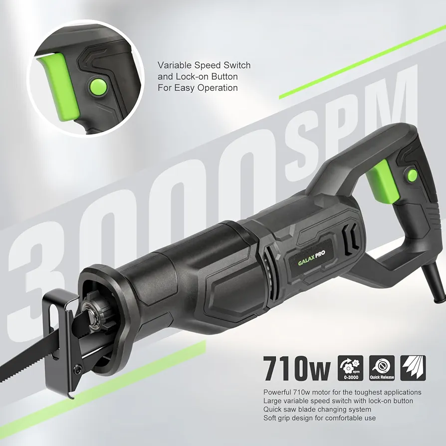 توان و سرعت بالا (710 W و ~3000 SPM) → عملکرد مناسب در برش انواع مواد.