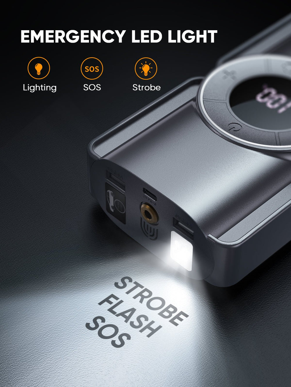 کاربرد اصلی: این دستگاه چندکاره برای مواقع اضطراری در خودرو طراحی شده است؛ شامل استارت باتری خودرو ۱۲ ولت، پمپ باد داخلی، پاوربانک برای شارژ الکترونیکی و چراغ اضطراری.