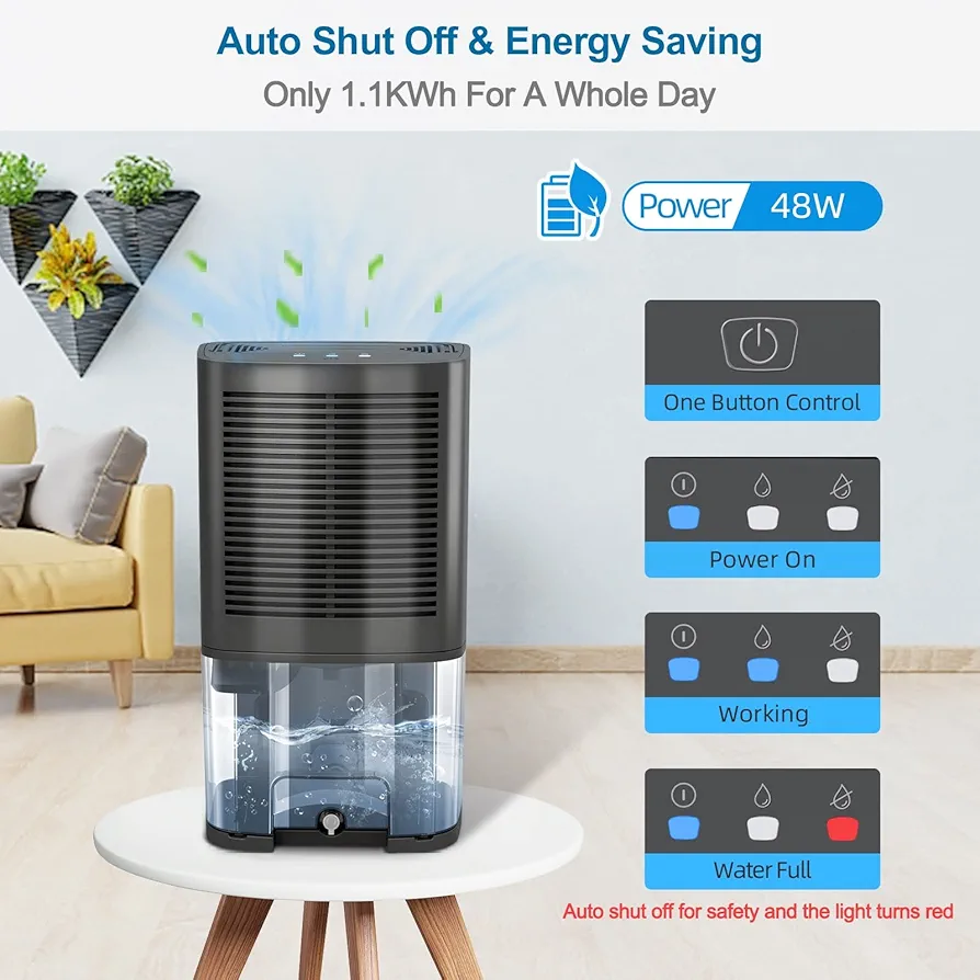 خاموش شدن خودکار و صرفه جویی در مصرف انرژی: رطوبت گیرهای خانگی کوچک با خاموش شدن خودکار می توانند از سرریز شدن آب جلوگیری کرده و از موتور در برابر آسیب محافظت کنند. با پر شدن مخزن آب چراغ نشانگر قرمز می شود تا به شما یادآوری کند که مخزن آب را خالی کنید. هنگامی که مخزن را تعویض می کنید، رطوبت گیرهای RV با عملکرد حافظه می توانند تنظیمات اصلی را تشخیص دهند و به کار خود ادامه دهند. برق داخلی با توان تنها 1.1 کیلووات در روز انرژی کمتری مصرف می کند. سازگارتر با محیط زیست نسبت به جاذب های شیمیایی.