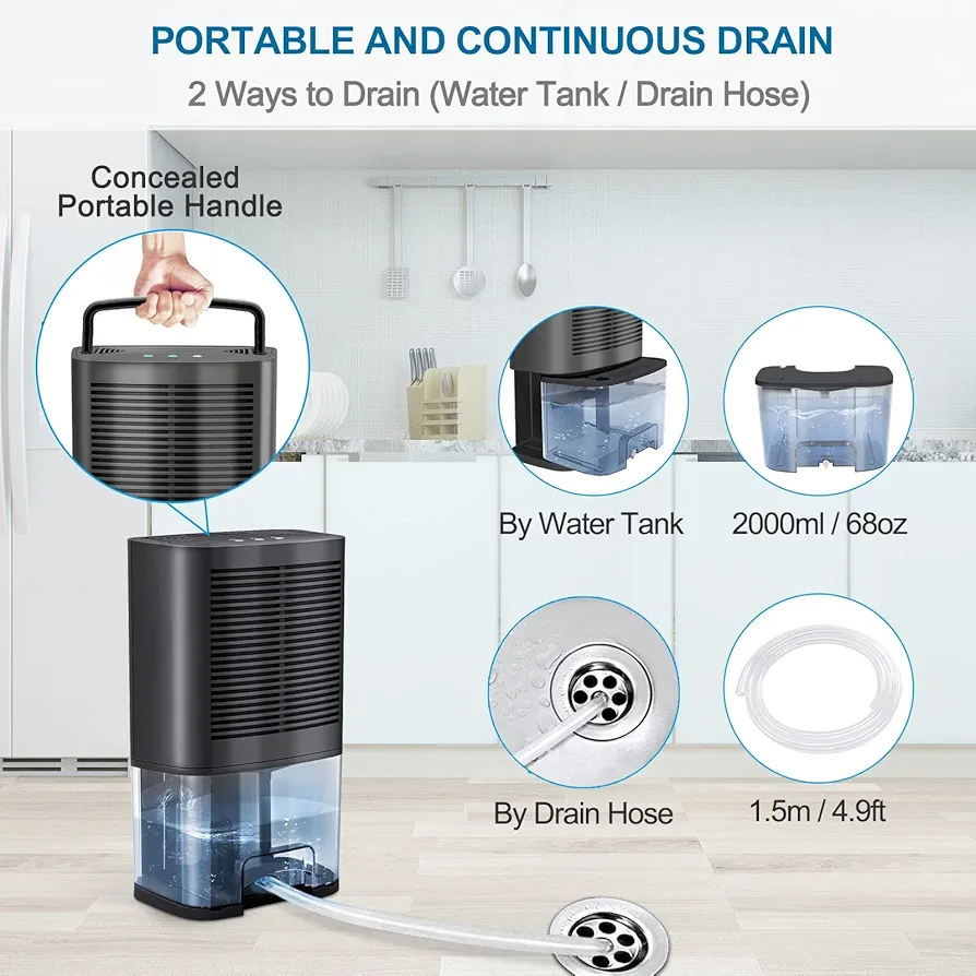 زهکشی مداوم شیلنگ تخلیه 5FT: این رطوبت گیر خانگی با ظرفیت 2000 میلی لیتر 2 راه برای تخلیه آب فراهم می کند. تنها راه این است که می توانید با ریختن مستقیم آب مخزن آب را خالی کنید. راه دیگر این است که این رطوبت گیر کمد دارای یک شلنگ تخلیه مداوم 5 فوتی برای تخلیه خودکار است. دست هایت را آزاد کن! نکات: رطوبت زدایی زمانی که دما کمتر از 59 درجه فارنهایت یا رطوبت زیر 35 درصد است، موثر نیست. محیط توصیه شده: دما > 59 ℉، رطوبت > 40%.