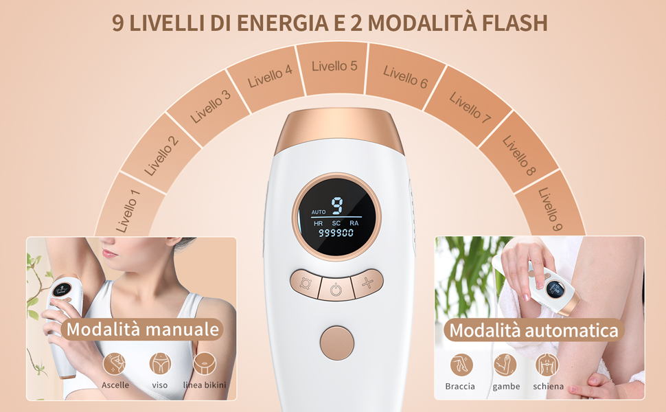 9 سطح انرژی قابل تنظیم برای حساسیت های مختلف پوست، ارائه سطوح مختلف از دقیق ترین، جامع ترین و موثرترین تجربه درمانی. هر چه سطح انرژی بالاتر باشد، نتیجه بهتری برای حذف موهای زائد خواهد داشت. توصیه می شود از پایین ترین سطح شروع کنید و به سمت بالا بروید. و 999900 فلاش برای یک عمر استفاده کافی است.