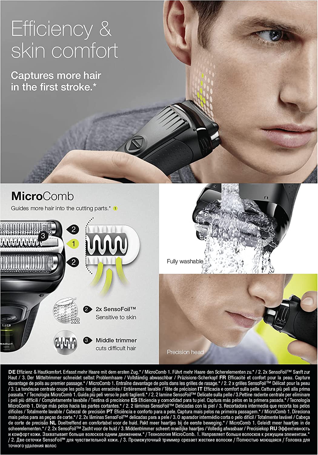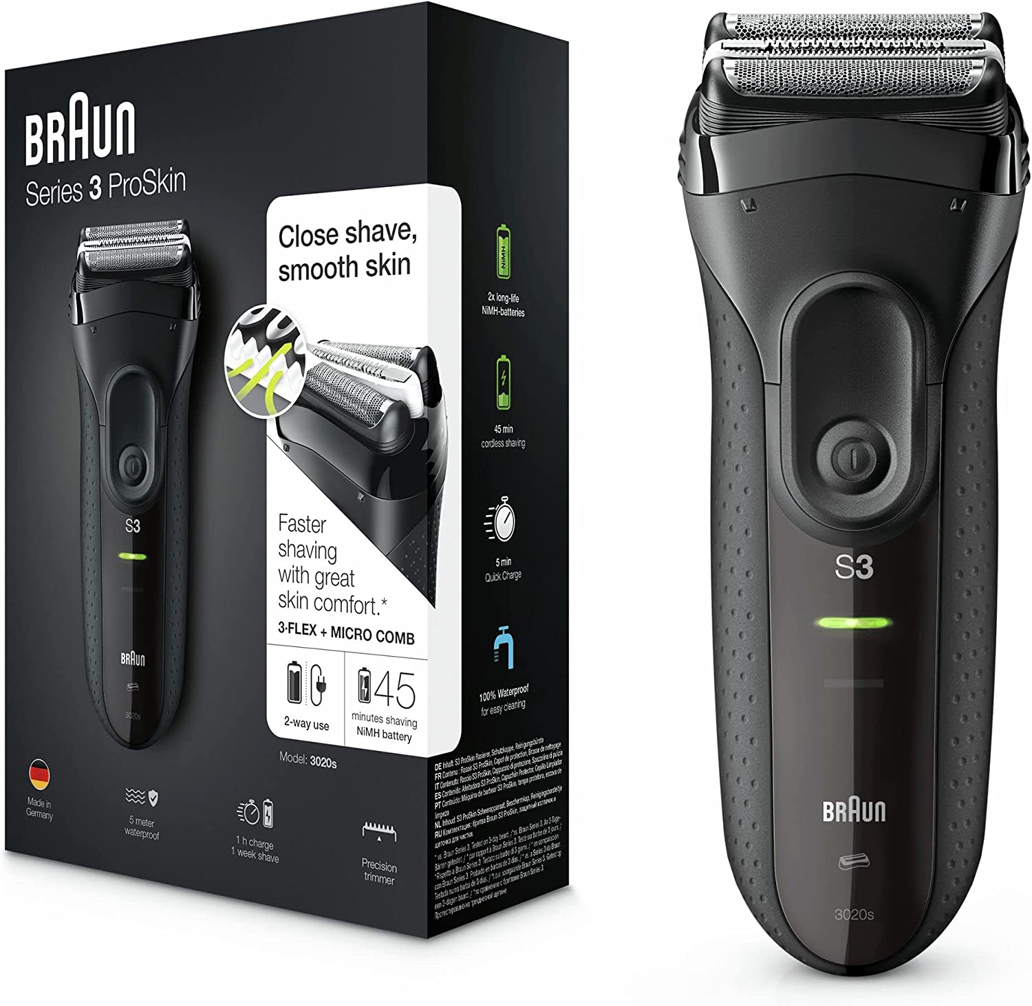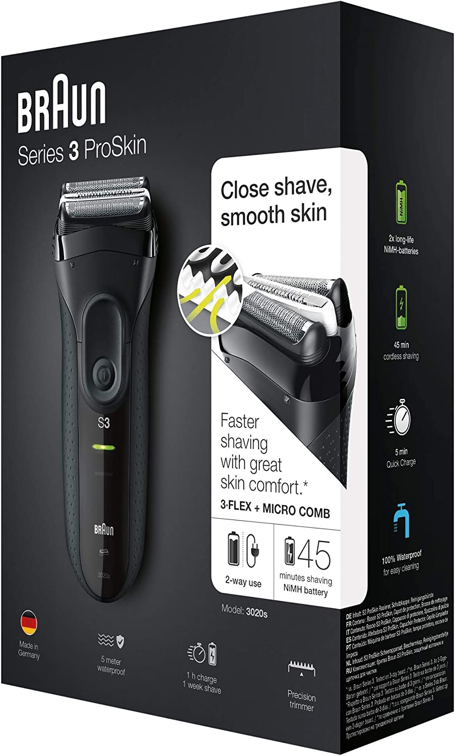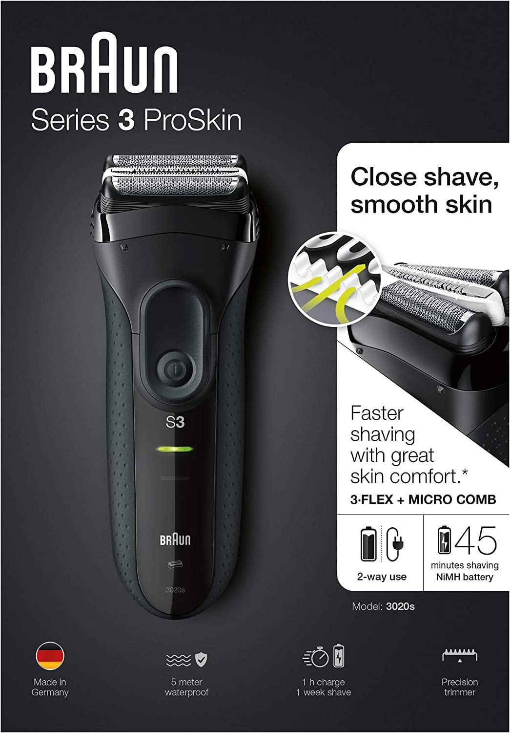 ریش تراش برقی فویل شارژی Braun Series 3 ProSkin 3020s اصلاح کارآمد را در یک حرکت انجام می دهد. 3 عنصر اصلاح شناور مستقل برای راحتی بیشتر با خطوط شما منطبق می شوند و یک شانه میکرو تخصصی برای گرفتن موهای بیشتر در یک حرکت* برای اصلاح سریعتر و ملایم تر. طراحی منحصر به فرد سر دقیق با مناطقی که دسترسی به آن دشوار است، مانند زیر بینی و ناحیه گردن، مقابله می کند، در حالی که دستگیره ارگونومیک و طراحی ضدآب آن نوید حمل و نقل ایمن را حتی در شرایط حمام مرطوب می دهد. *در مقایسه با سری 3 قبلی براون. روی ریش 3 روزه تست شده است.