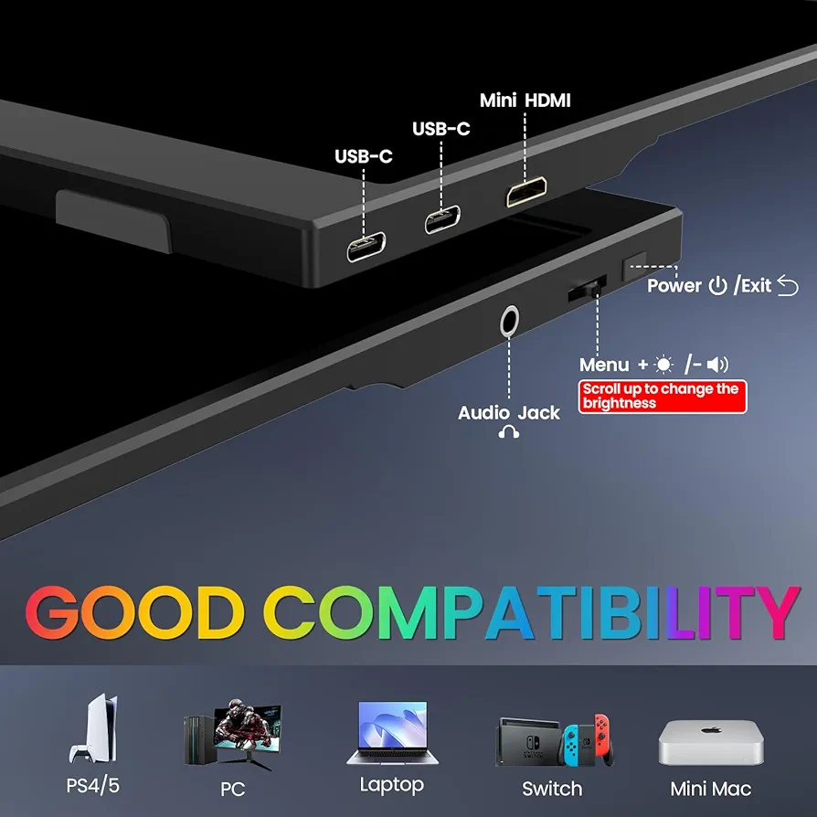 پورتهای اتصال: دو عدد USB‑C (Type‑C) و Mini HDMI برای اتصال انعطافپذیر به لپتاپ، کنسول، گوشی و …