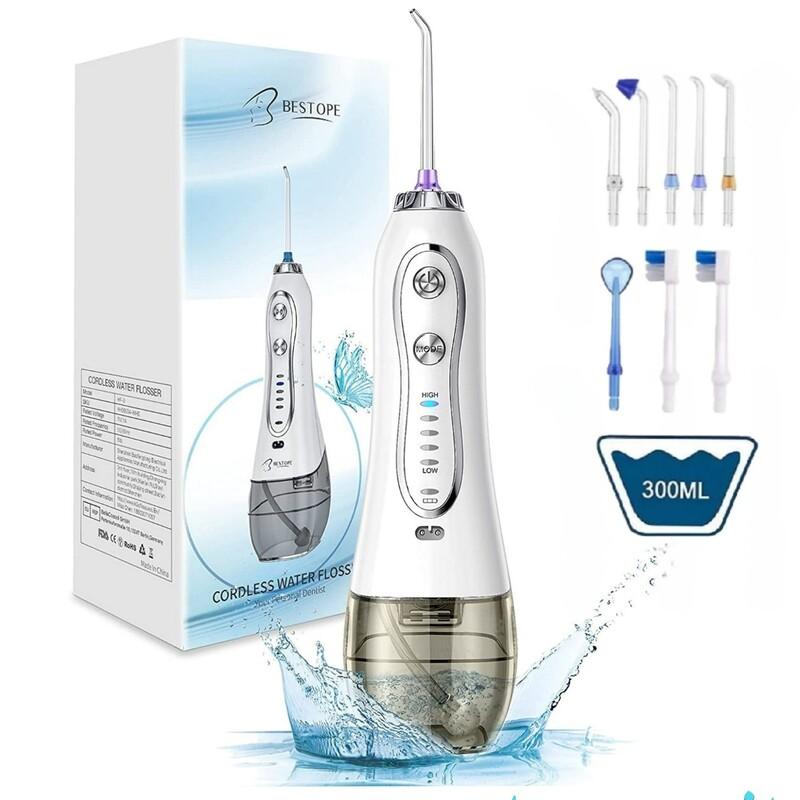 واترجت دندان دهانی آب شارژی 300 میلی لیتری BESTOPE برای لوازم دندانپزشکی با 5 حالت، 6 نوک جت، ضد آب IPX7، قابل حمل برای سفر در منزل