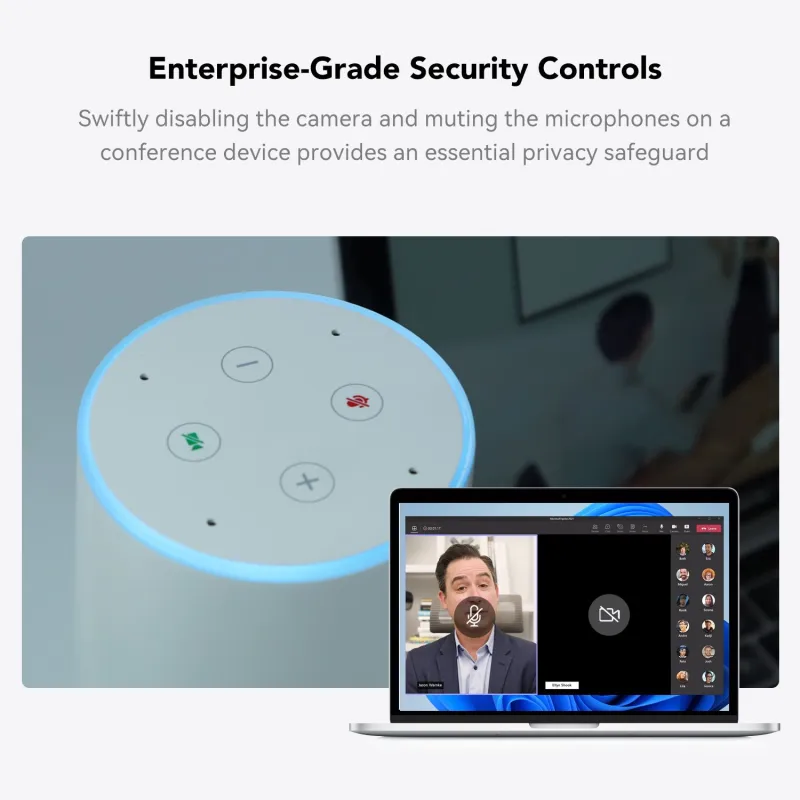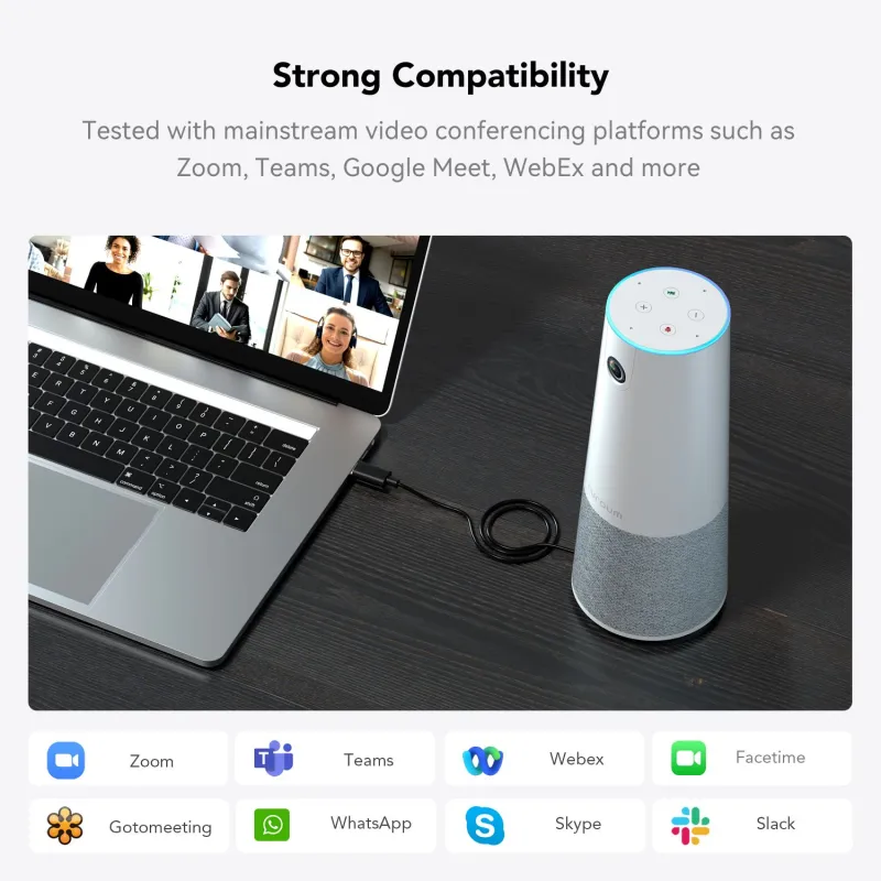 4 میکروفون حذف نویز و بلندگوی Hi-Fi دوربین وب اتاق کنفرانس دارای 4 میکروفون MEMS همه جهته 360 درجه است که به لطف الگوریتم صوتی مجهز به هوش مصنوعی می تواند به طور موثر نویز و اکو را حذف کند. نویز محیطی حذف می شود و صدا در فاصله 13 فوتی به طور طبیعی تر دریافت می شود. فناوری دوبلکس کامل باعث می شود که هر شرکت کننده در جلسه به وضوح شنیده شود. بلندگوی بهینه شده می تواند صدای افراد را برجسته کند و صدایی بدون اعوجاج و واضح را حتی در حجم بالا تضمین کند.