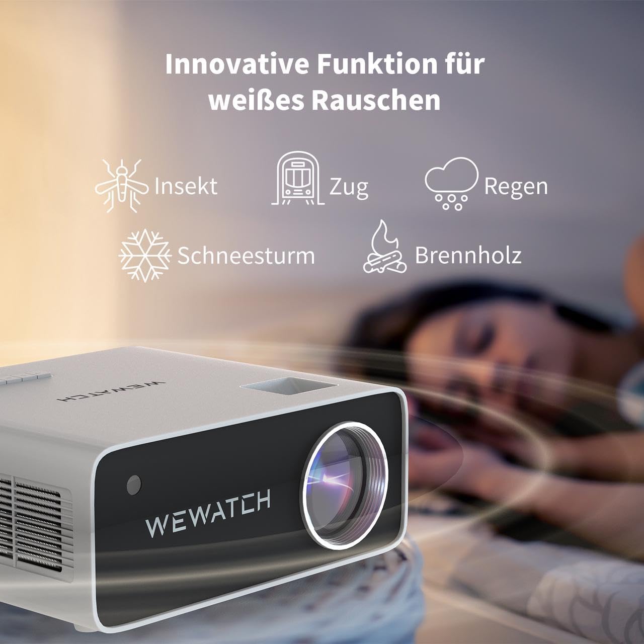 پروژکتور WEWATCH V51 Pro اولین پروژکتور LCD است که عملکرد نویز سفید را به روشی نوآورانه در یک پروژکتور ادغام می کند. این شامل 5 تا از آرامش بخش ترین صداها با نویز سفید است: هیزم، باران، طوفان برف، قطار و حشرات و همچنین 5 تایمر: 10 دقیقه، 20 دقیقه، 30 دقیقه، 45 دقیقه و 60 دقیقه. شما می توانید آن را با توجه به نیاز خود تنظیم کنید. پروژکتور V51 Pro نه تنها یک پروژکتور برای سرگرمی های خانگی است، بلکه به طور موثری سر و صدای پس زمینه را پنهان می کند و کودک شما را به خواب عمیق می کشاند.