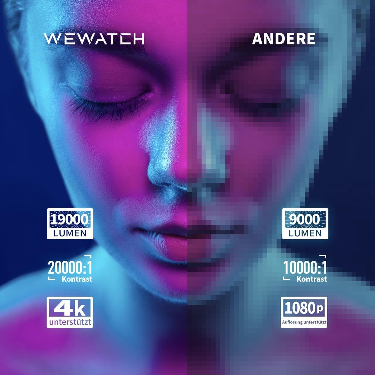 تصویر با وضوح بالا پروژکتور WEWATCH V51 Pro دارای نسبت کنتراست 10000:1 در 1080p FHD و روشنایی 400 ANSI لومن 18500 لومن است. تصاویر پر از جزئیات ظریف و رنگ های زنده هستند. از یک مهمانی واقعی برای چشم ها از آسایش خانه خود لذت ببرید.