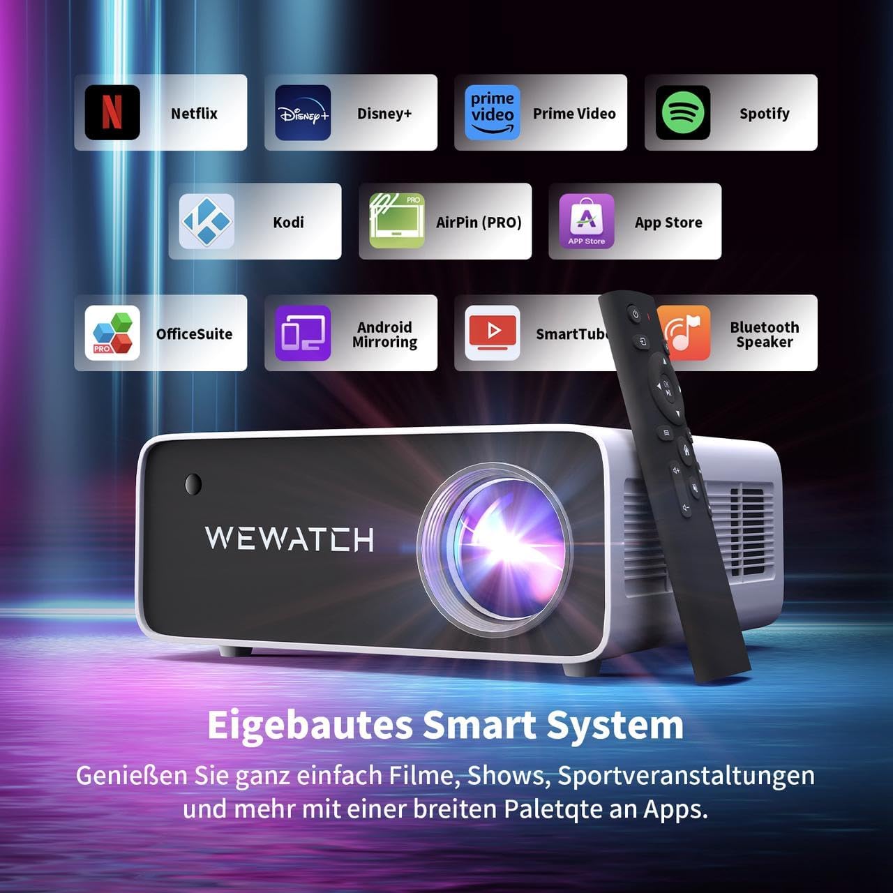 پروژکتور اندروید و پروژکتور هوشمند: ویدیو پروژکتور مدل V51PRO برند WEWATCH یک پروژکتور WiFi Full HD 1080P . میتوانید به راحتی از فیلمها، نمایشها، ورزشهای زنده و موسیقی بدون نیاز به اتصال به Fire Stick لذت ببرید.