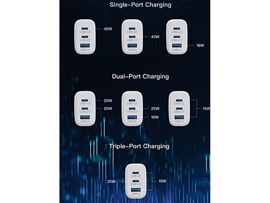 توان خروجی: 45 وات (بسته به مدل، این توان روی پورت USB-C یا ترکیبی پورتها تقسیم میشود). مثال: در مدل IAC-5046، در حالت USB-C PD تا 45 وات دارد.