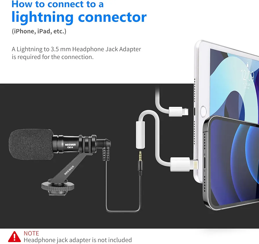 Plug-and-Play: برای شروع، میکروفون را با کابل صوتی 3.5 میلی متری TRS به TRRS به iPhone 6s یا مدل های قبلی خود وصل کنید. برای آیفون 7 و جدیدتر، آداپتور لایتنینگ به جک هدفون 3.5 میلی‌متری مورد نیاز است (شامل نمی‌شود)