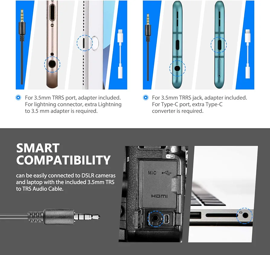 سازگاری گسترده: سازگار با آیفون، آی پد، گوشی و تبلت اندرویدی، دوربین های DLSR، دوربین های فیلمبرداری و غیره. آداپتور لایتنینگ به 3.5 میلی متر و آداپتور USB-C به 3.5 میلی متر گنجانده نشده است