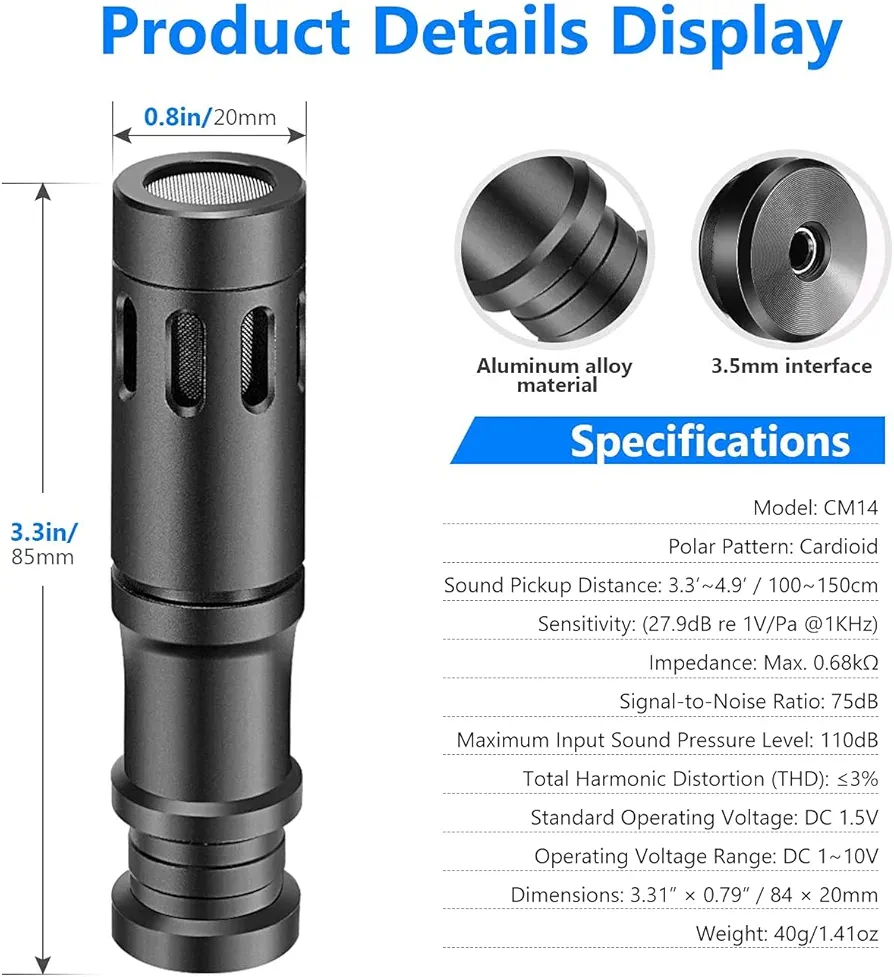 برای دستگاه های دارای جک 3.5 میلی متری، از جمله گوشی های هوشمند، تبلت ها و دوربین های DSLR استفاده می شود. وصل کنید و ضبط کنید، بدون نیاز به باتری.