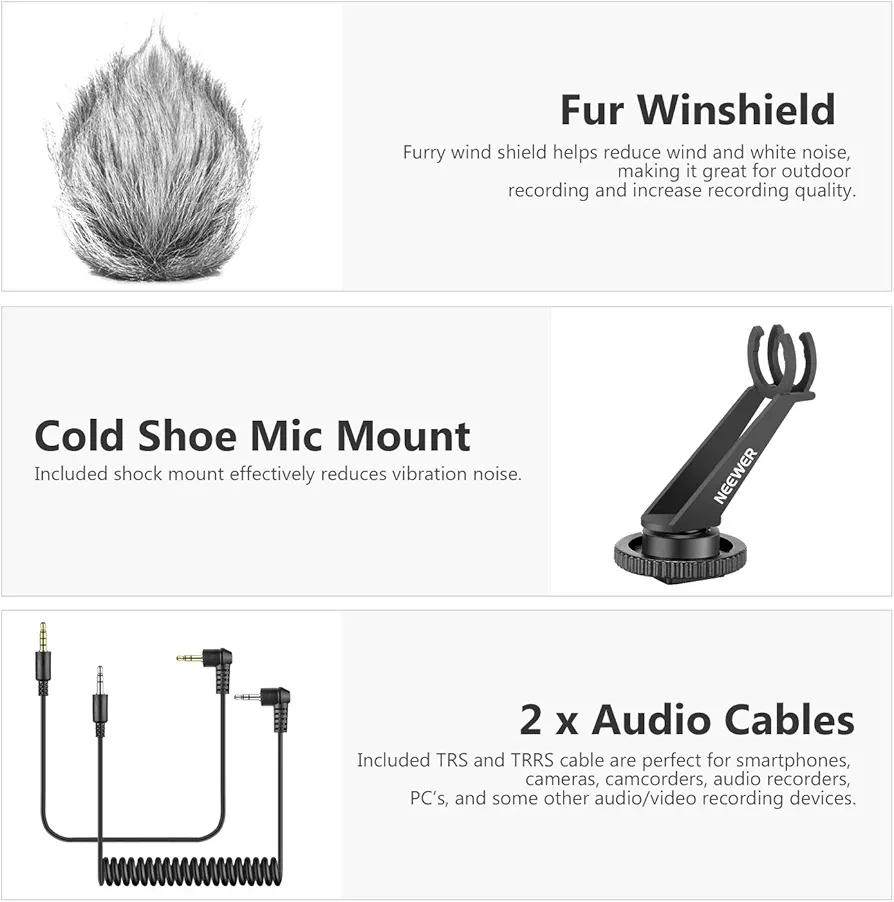 محتویات بسته: میکروفون تلفن CM14 جدیدتر، کابل صوتی 3.5 میلی متری TRS به TRRS، کابل صوتی 3.5 میلی متری TRS به TRS، پایه میکروفون کفش سرد، شیشه جلوی خزدار، پوشش فوم